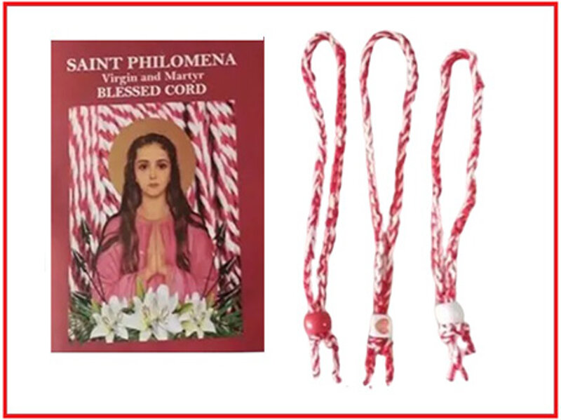 The Cord of Saint Philomena is made with threads of cotton or wool of white and red color. In one of the extremities it has two knots to remember the Virginity and Martyrdom of the Saint. This is worn under ordinary clothes like a belt.