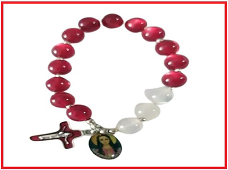 This handmade rosary bracelet is made with 13 red and 3 white beads, a crucifix and a St. Philomena medal. Bracciale coroncina di Santa Filomena con 13 grani rossi e 3