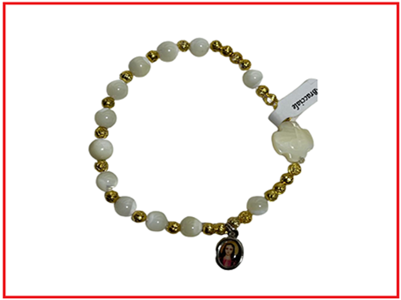 This handmade Saint Philomena bracelet is composed ofmother-of-pearl and gold-coloured beads.