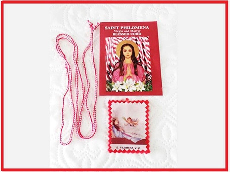 This pack contains: St. Philomena blessed waist cord, scapular and booklet with prayers on the cord of St Philomena. Good way to introduce friends to St Philomena along with bestowing on them a very traditional and blessed item of the devotion to St Philomena.
